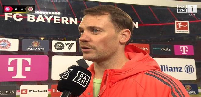 德甲第12輪,拜仁慕尼黑主場(chǎng)3-1逆轉(zhuǎn)擊敗圣保利,賽后, 拜仁門將諾伊爾接受了DAZN的采訪。